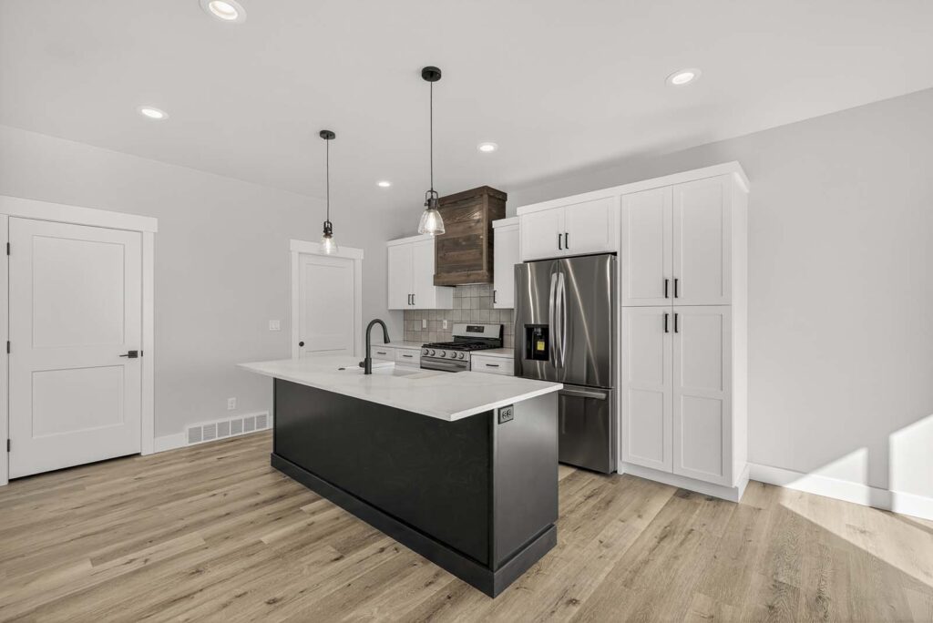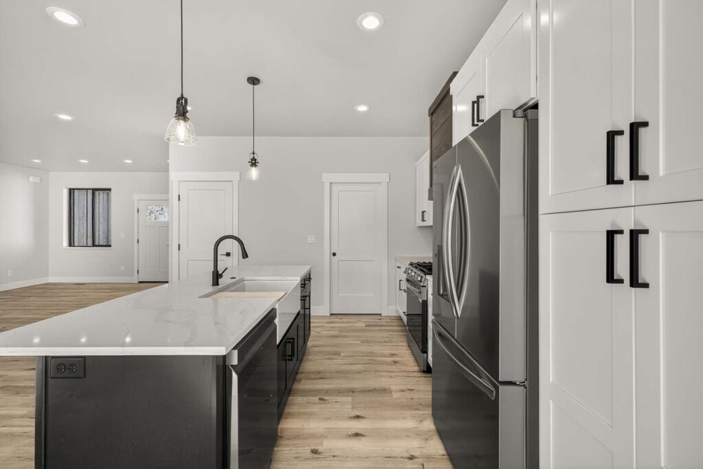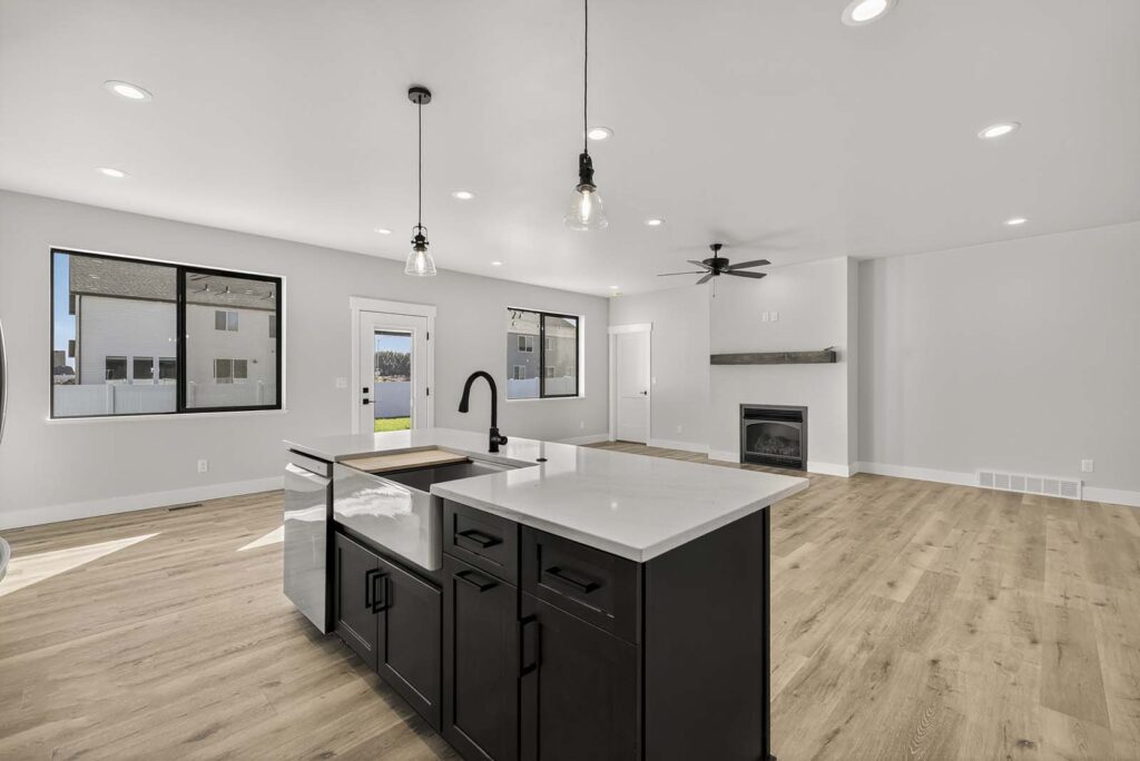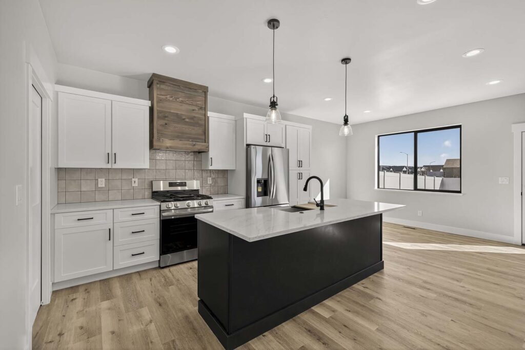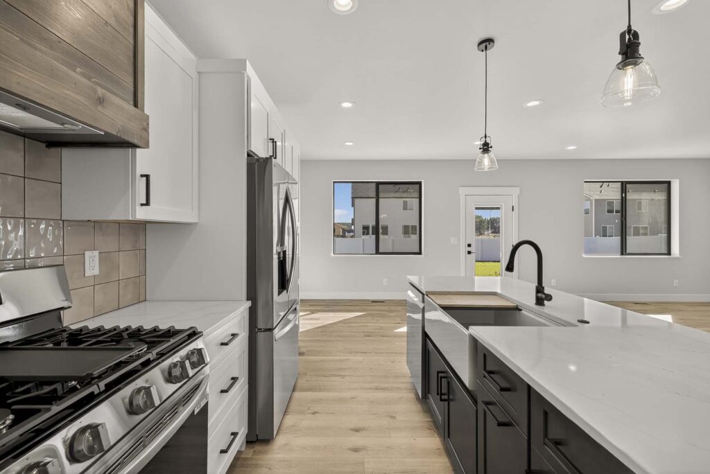 Chef-Inspired Kitchens: Featuring a spacious center island with contrasting dark cabinetry, modern pendant lighting, and a stainless steel farmhouse sink with a matte black faucet.