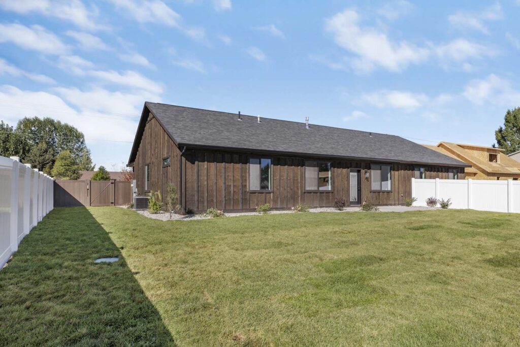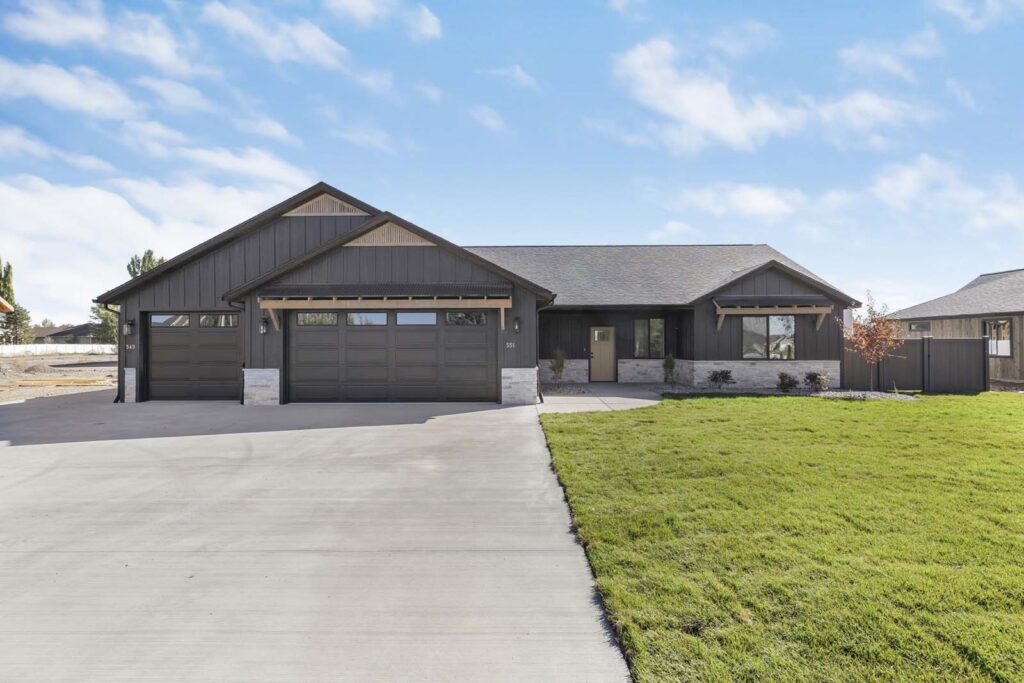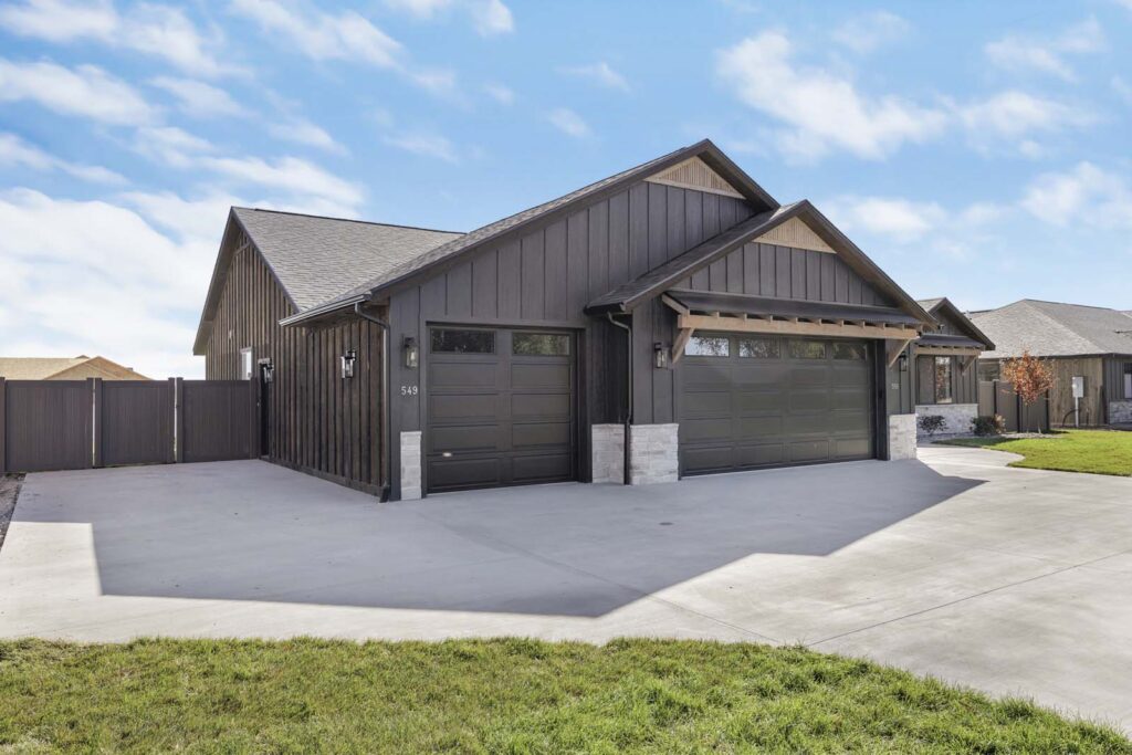 Spring Creek homes are designed to make a statement from the moment you pull into the driveway. This exterior showcases a sophisticated "Modern Mountain" aesthetic, featuring striking charcoal vertical board-and-batten siding grounded by a wrap-around stone wainscoting. The design is softened by natural wood timber accents and custom pergola-style overhangs that add warmth and dimension. With a spacious three-car garage and architectural rooflines, this is a home that balances commanding curb appeal with welcoming charm.