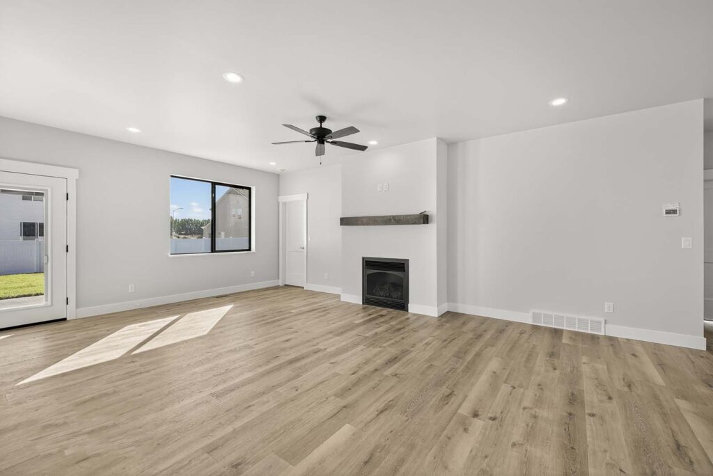 Cozy Gathering Spaces: Living areas anchored by a modern gas fireplace with a custom wood mantel, creating the perfect focal point for your home.
